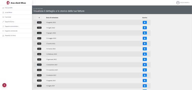 Alla voce “Le tue fatture” puoi visualizzare il dettaglio e lo storico di tutte le bollette relative ai servizi che hai con MICSO IT e scaricare il relativo file pdf.