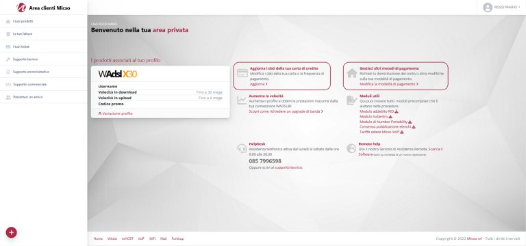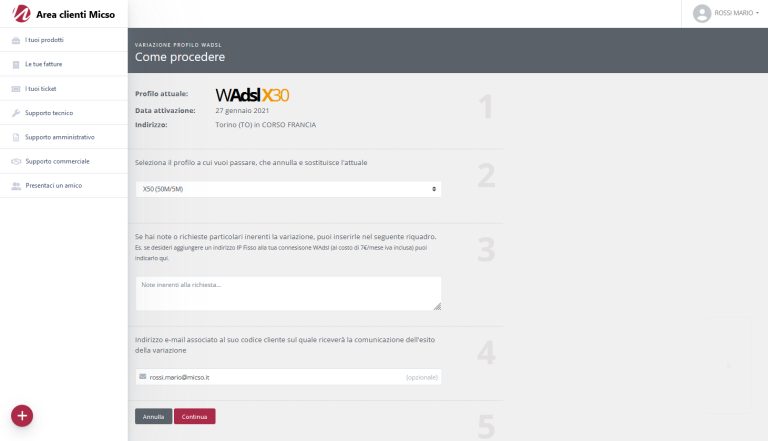 Alla voce “I tuoi prodotti” potrai richiedere la variazione di profilo per tutti i servizi che hai attivi con MICSO IT.